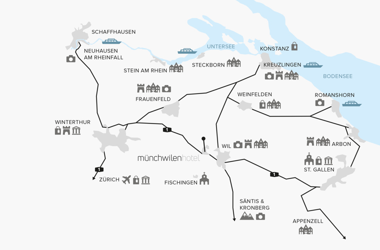 Das Hotel Münchwilen ist bestens gelegen, um schönste Ausflüge in der Region zu machen, Sehenswürdigkeiten zu besuchen, durch Altstädte zu schlendern, shoppen oder einfach die Natur zu geniessen.